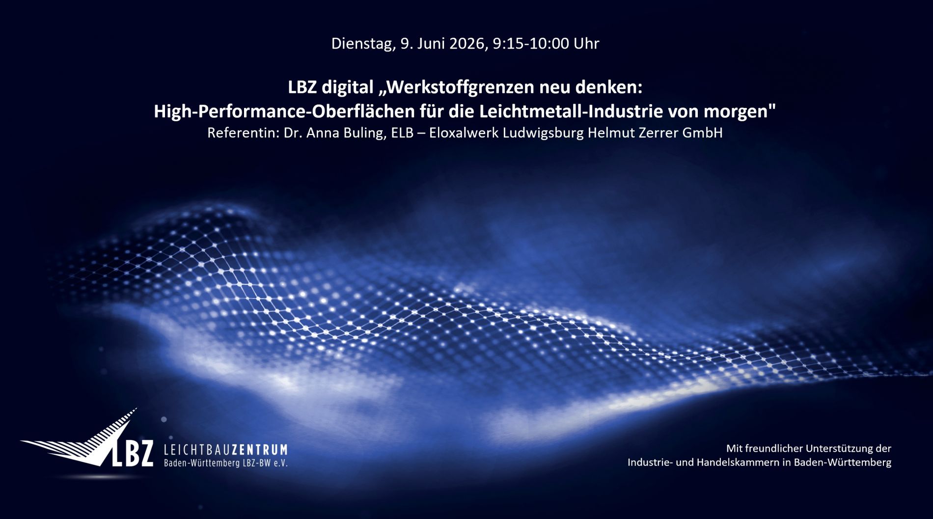 High-Performance-Oberflächen für die Leichtmetall-Industrie von morgen" von 9:15-10:00 Uhr virtuell zu ELB – Eloxalwerk Ludwigsburg Helmut Zerrer GmbHeinladen zu dürfen.