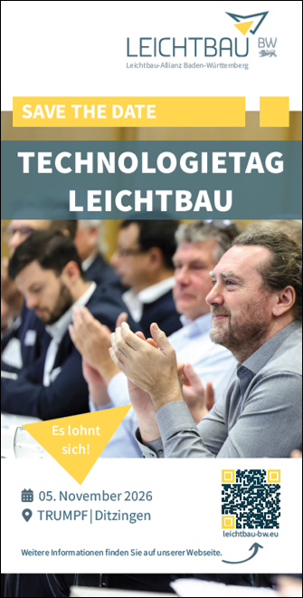 Als Leichtbau-Allianz Baden-Württemberg organisieren wir jährlich den Technologietag Leichtbau, der in diesem Jahr am 5. November 2026 bei TRUMPF in Ditzingen stattfindet.