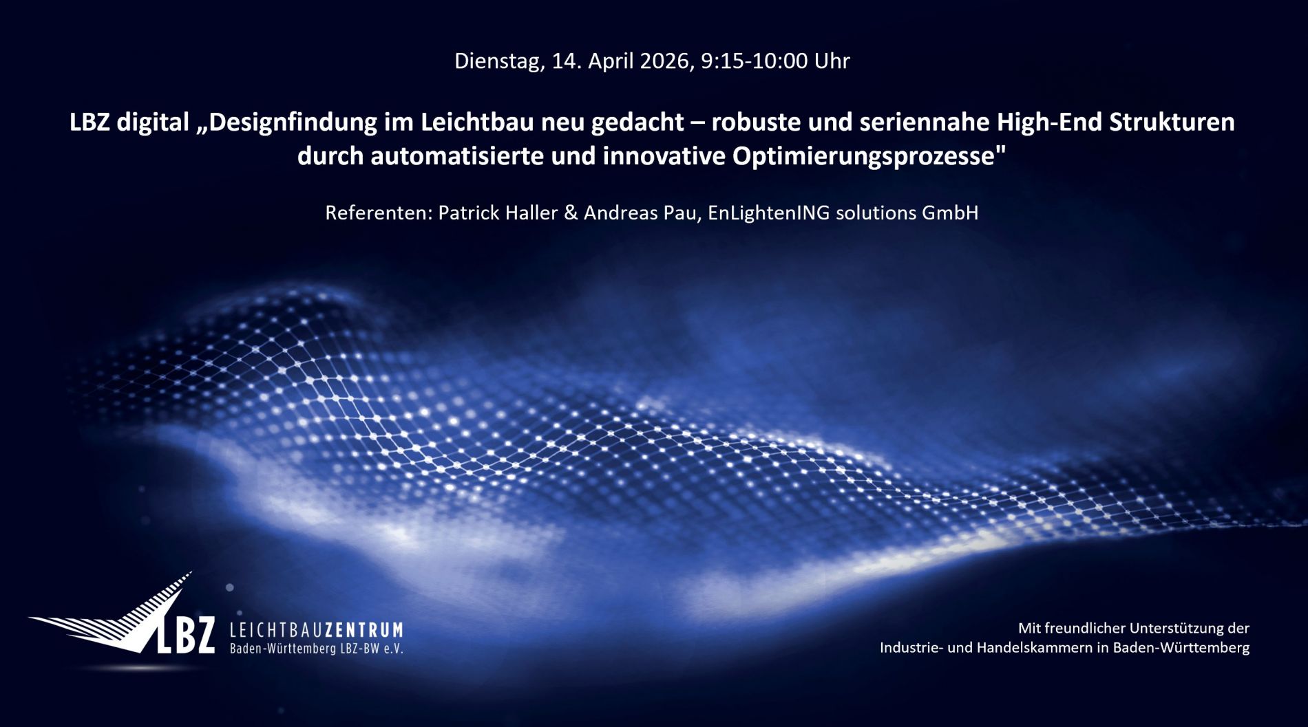Wir freuen uns, Sie am Dienstag, 14. April 2026 mit LBZ digital „Designfindung im Leichtbau neu gedacht – robuste und seriennahe High-End Strukturen durch automatisierte und innovative Optimierungsprozesse“ von 9:15-10:00 Uhr virtuell zu EnLightenING solutions einladen zu dürfen.