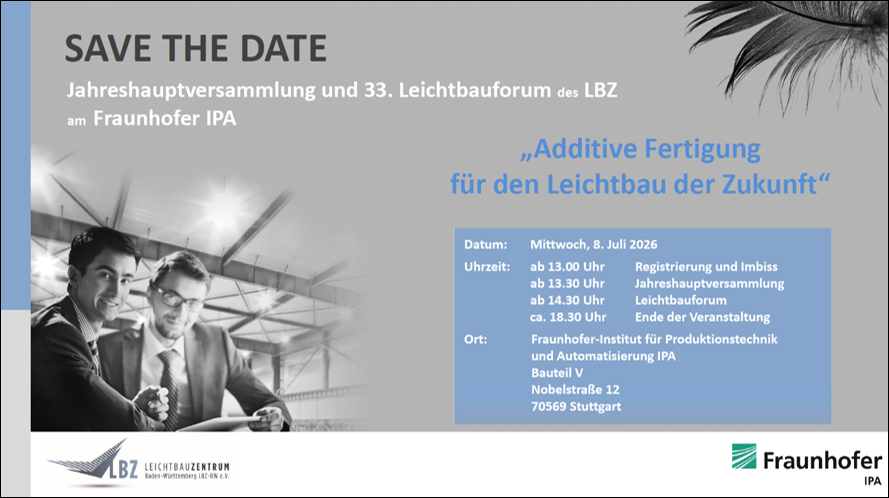 Jahreshauptversammlung & 33. Leichtbauforum des LBZ am 8.07.26 am Fraunhofer IPA, Stuttgart